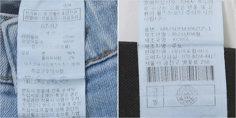| 1. 제품 소재 (섬유의 조성 또는 혼용률을 백분율로 표시, 기능성인 경우 성적서 또는 허가서) | 겉감:면98% 폴리우레탄2% |