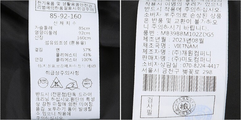 | 1. 제품 소재 (섬유의 조성 또는 혼용률을 백분율로 표시, 기능성인 경우 성적서 또는 허가서) | 겉감:면57% 폴리에스터43% 안감:폴리에스터100% |