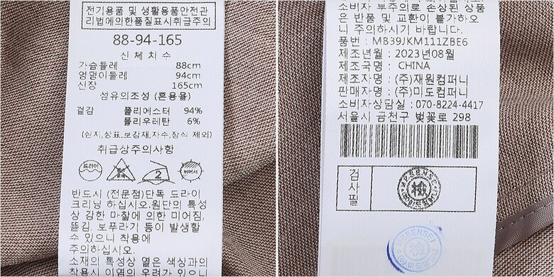 | 1. 제품 소재 (섬유의 조성 또는 혼용률을 백분율로 표시, 기능성인 경우 성적서 또는 허가서) | 겉감:폴리에스터94% 폴리우레탄6% |