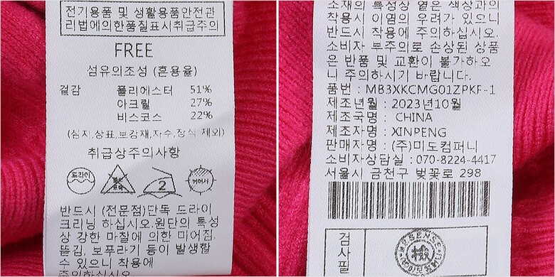 | 1. 제품 소재 (섬유의 조성 또는 혼용률을 백분율로 표시, 기능성인 경우 성적서 또는 허가서) | 겉감:폴리에스터51% 아크릴27% 비스코스22% |
