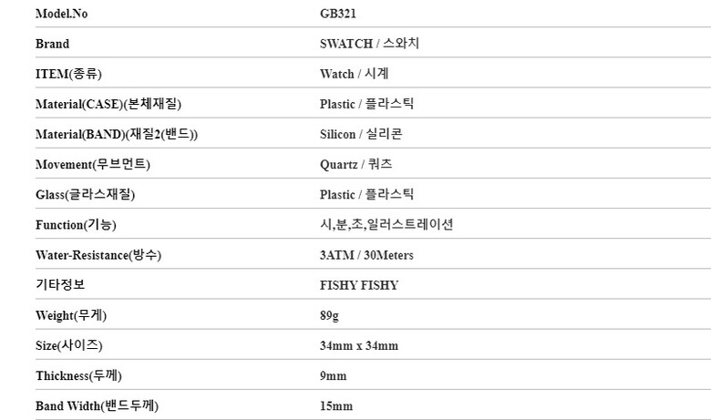 | 7. 주요 사양 | 플라스틱 시계 쿼츠 |