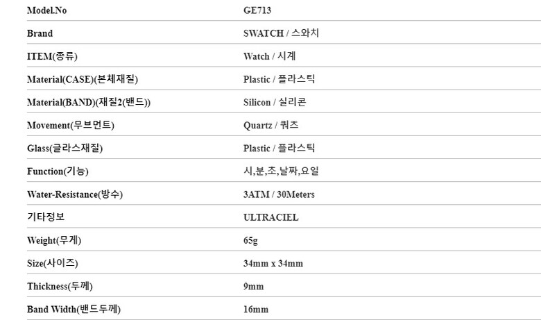 | 7. 주요 사양 | 플라스틱 시계 쿼츠 |
