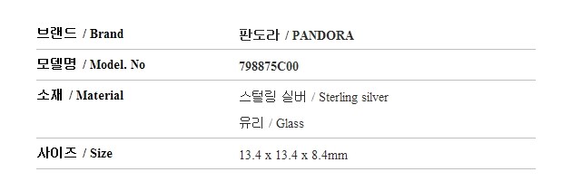 | 1. 소재 / 순도 / 밴드재질 | 실버 / 쥬얼리 - 스털링실버 / 팬던트 - 유리 |