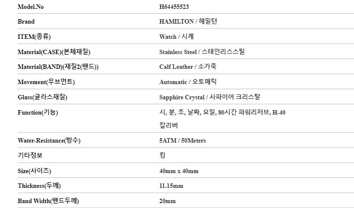 | 7. 주요 사양 | 스테인리스스틸 시계 오토매틱 |