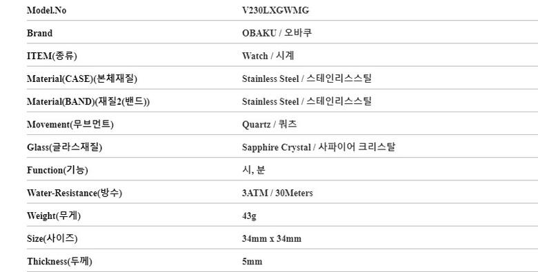 | 7. 주요 사양 | 스테인리스스틸 시계 쿼츠 |
