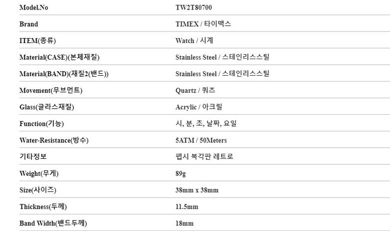 | 7. 주요 사양 | 스테인리스스틸 시계 쿼츠 |