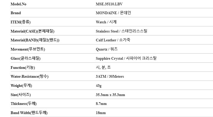 | 7. 주요 사양 | 스테인리스스틸 시계 쿼츠 |