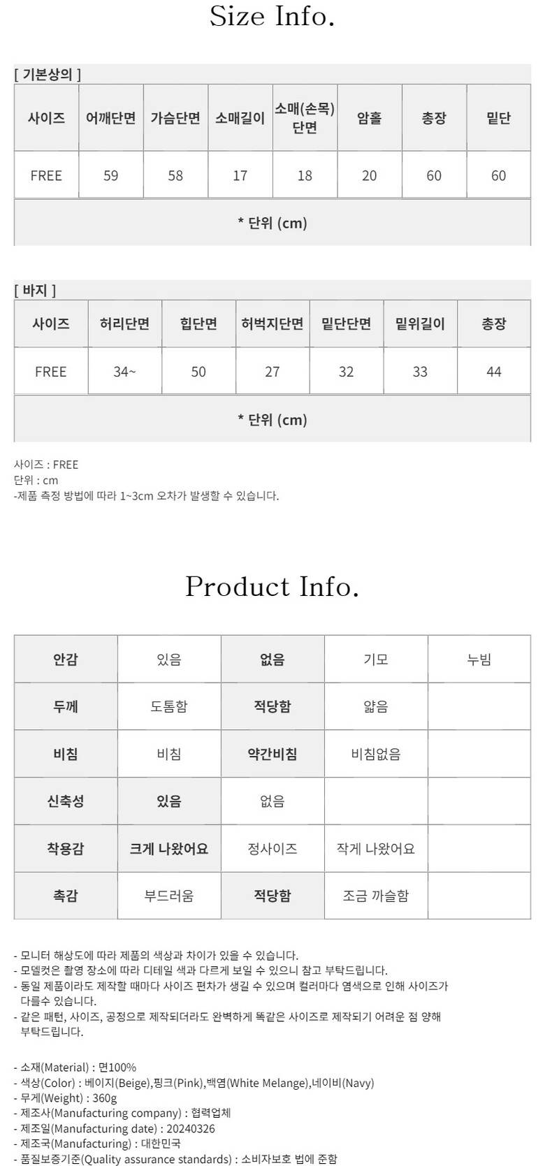 [ 기본상의 ] 어깨단면 / 가슴단면 / 소매길이 / 소매(손목)단면 / 암홀 / 총장 / 밑단 (FREE)59 / 58 / 17 / 18 / 20 / 60 / 60 [ 바지 ] 허리단면 / 힙단면 / 허벅지단면 / 밑단단면 / 밑위길이 / 총장 (FREE)34~ / 50 / 27 / 32 / 33 / 44
