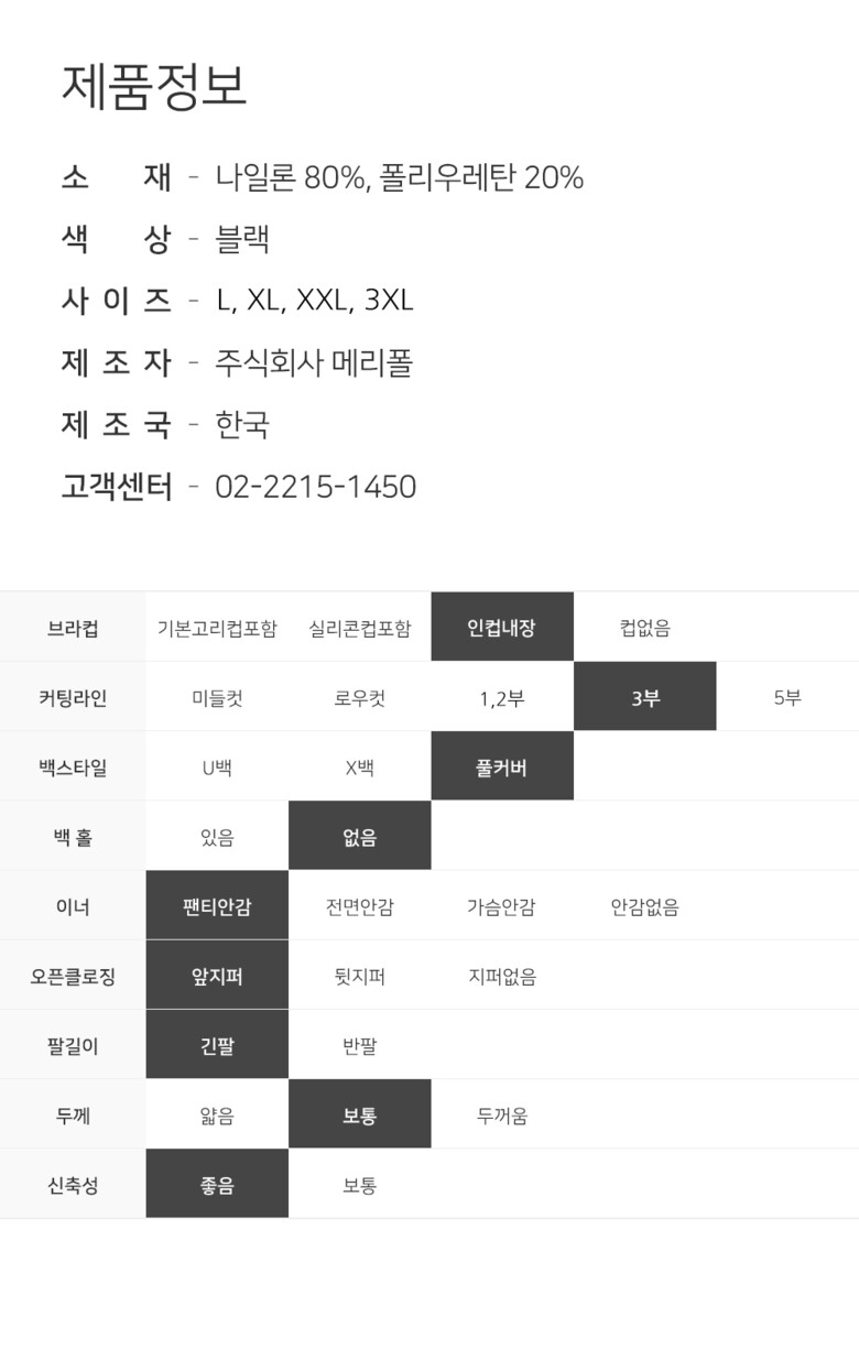 | 1. 제품 소재 (섬유의 조성 또는 혼용률을 백분율로 표시, 기능성인 경우 성적서 또는 허가서) | 나일론 80%, 폴리우레탄 20% |