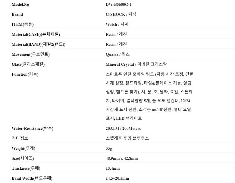 지샥 DW-B5600G-1DR 5600시리즈 디지털 스퀘어 블루투스 투명 남성 우레탄시계