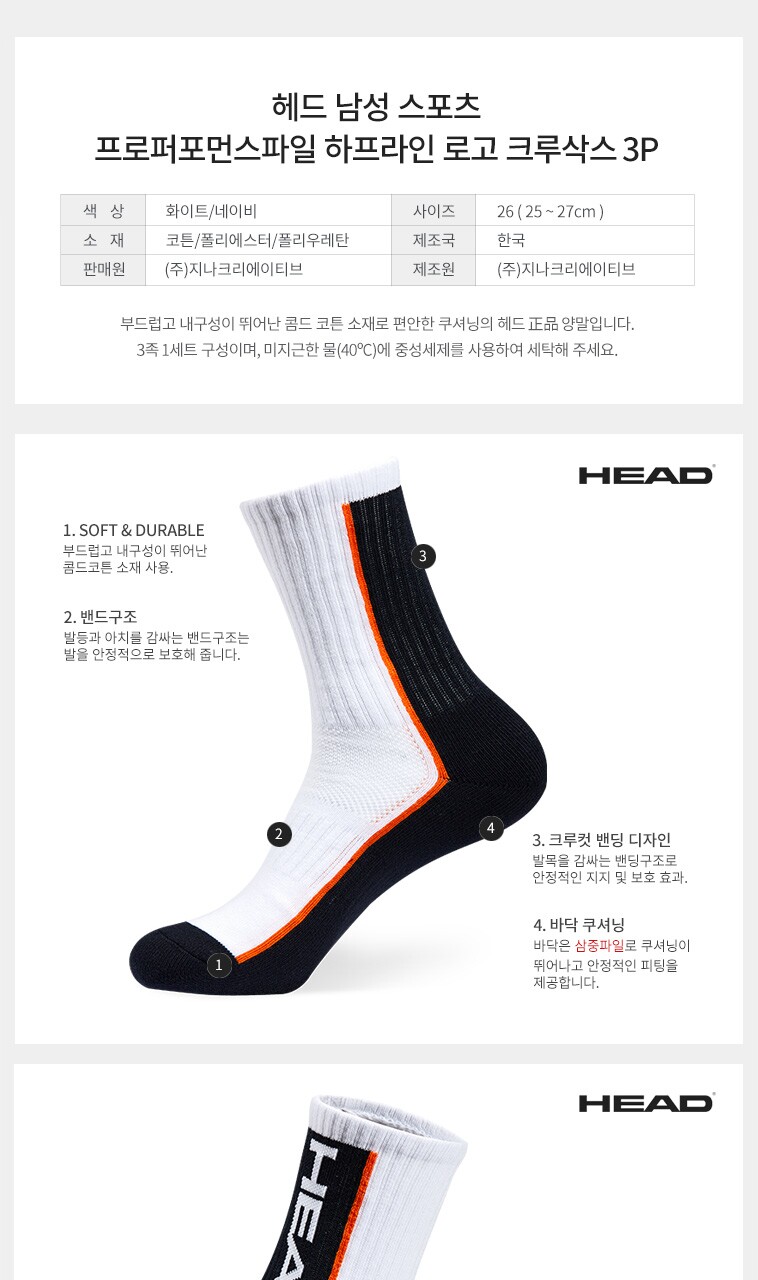 헤드 남성 스포츠 프로퍼포먼스파일 하프라인 로고 크루삭스 3P_WN
