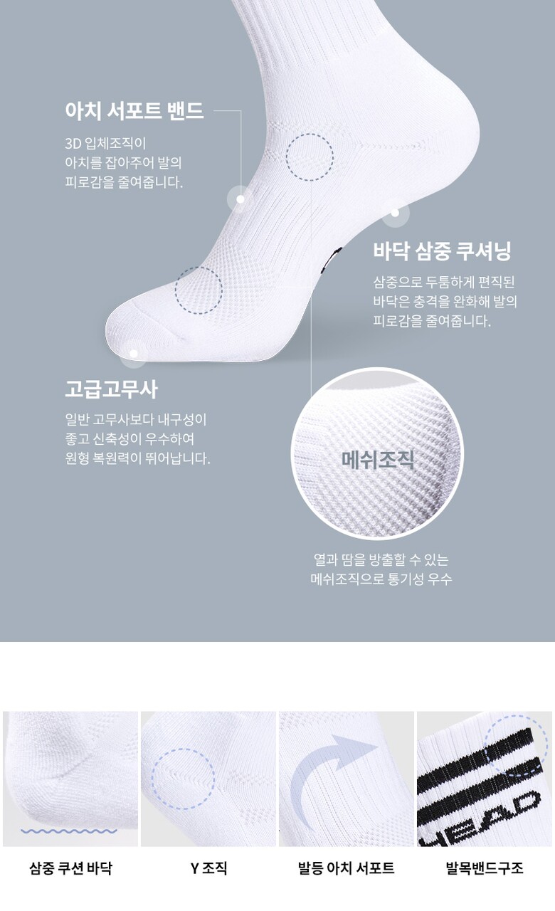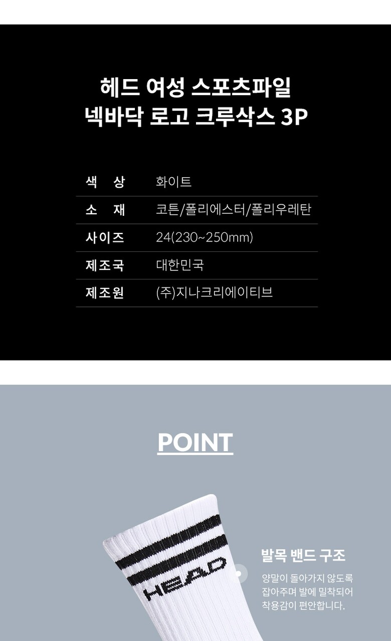 헤드 여성 스포츠파일 넥바닥 로고 크루삭스 3P_WH