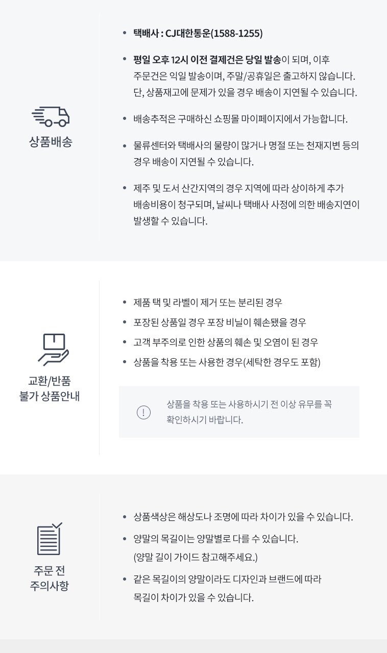 • 처음 배송된 상품상태와 다를 경우(세탁/착용 후 외출하신 경우) 반품이 불가합니다.