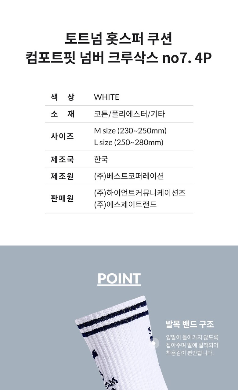 토트넘 쿠션 컴포트핏 넘버 크루삭스 no7. 4P_WH