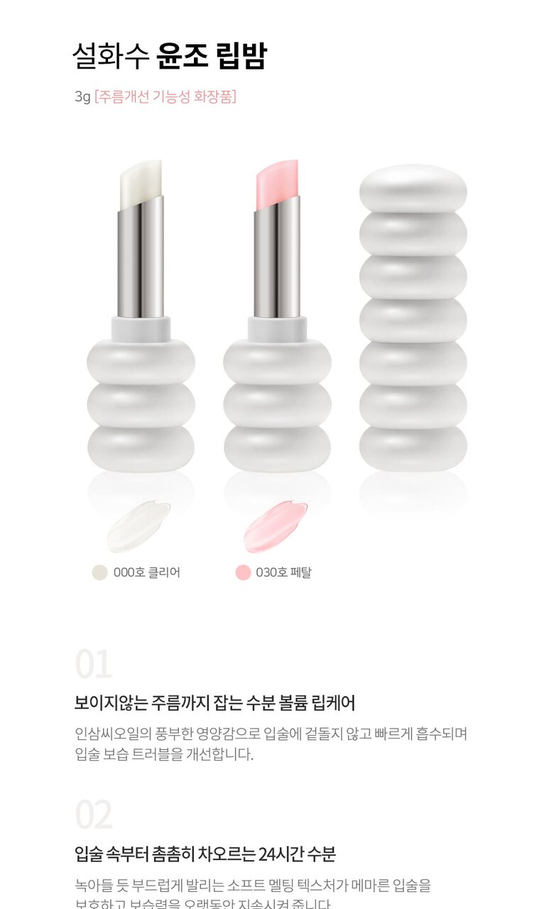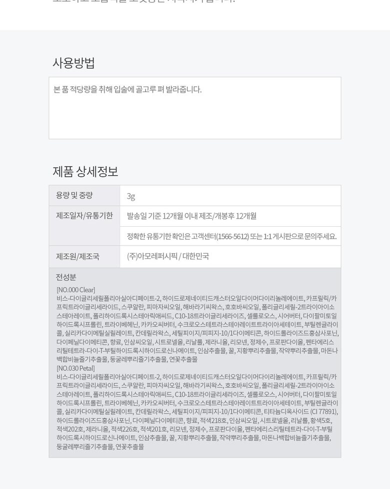 7. 주요성분 | [NO.030 Petal] 비스-다이글리세릴폴리아실아디페이트-2, 하이드로제네이티드캐스터오일다이머다이리놀레에이트, 카프릴릭/카 프릭트라이글리세라이드, 스쿠알란, 피마자씨오일, 외 상세참조 |