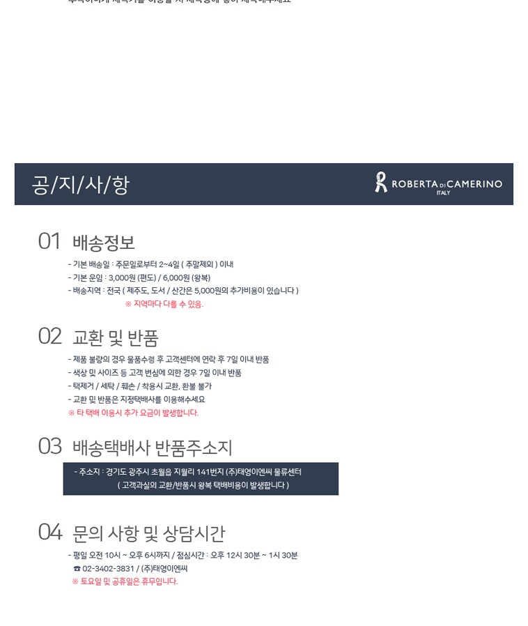 • 모든 규정은 전자상거래법에 의거하며, 택배사정으로 배송이 지연된 경우 재화를 공급받은 날로부터 7일 이내에 반품 가능합니다.