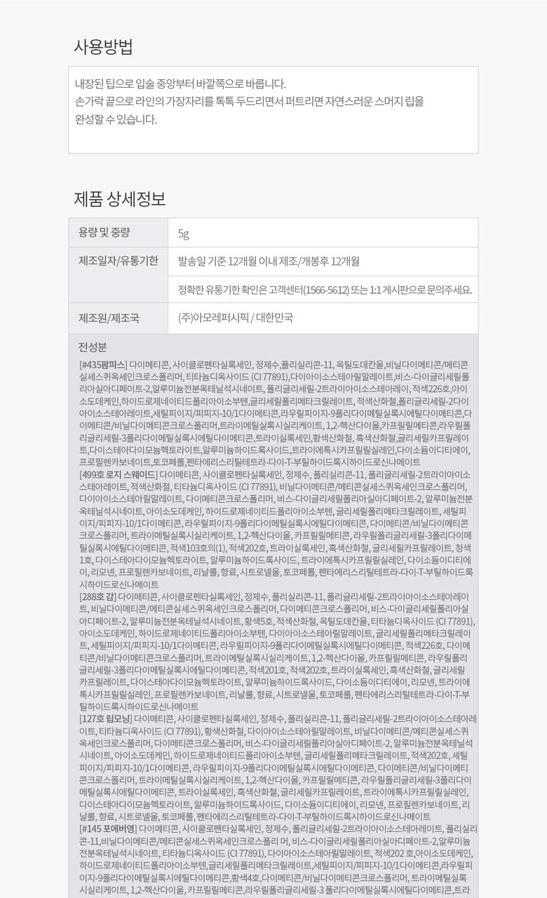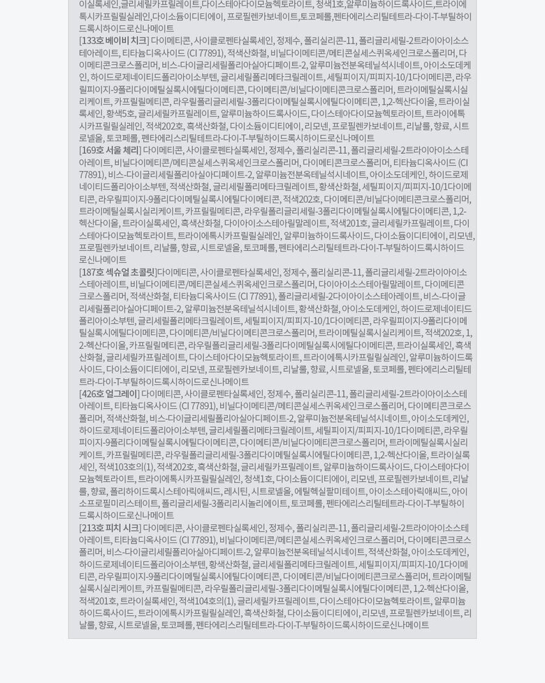 7. 주요성분 | [#435팜파스] 다이메티콘, 사이클로펜타실록세인, 정제수,폴리실리콘-11, 옥틸도데칸올,비닐다이메티콘/메티콘 실세스퀴옥세인크로스폴리머, 티타늄디옥사이드 (CI 77891),다이아이소스테아릴말레이트, 외 상세참조 |