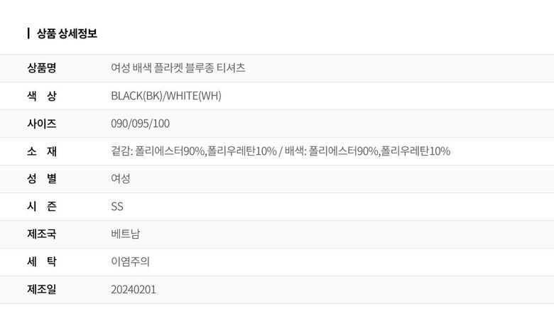 | 1. 제품 소재 (섬유의 조성 또는 혼용률을 백분율로 표시, 기능성인 경우 성적서 또는 허가서) | 겉감: 폴리에스터90%,폴리우레탄10% / 배색: 폴리에스터90%,폴리우레탄10% |