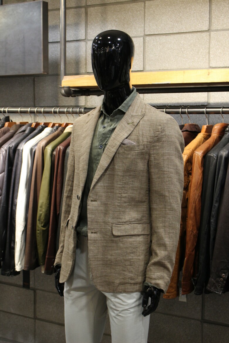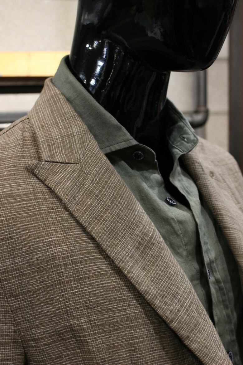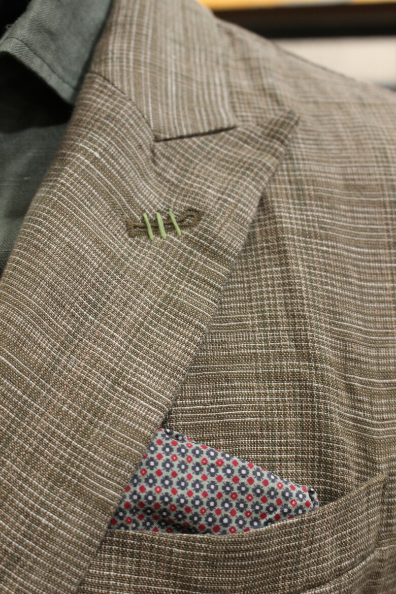 클래식한 느낌이 강조된 브라운체크 린넨자켓입니다