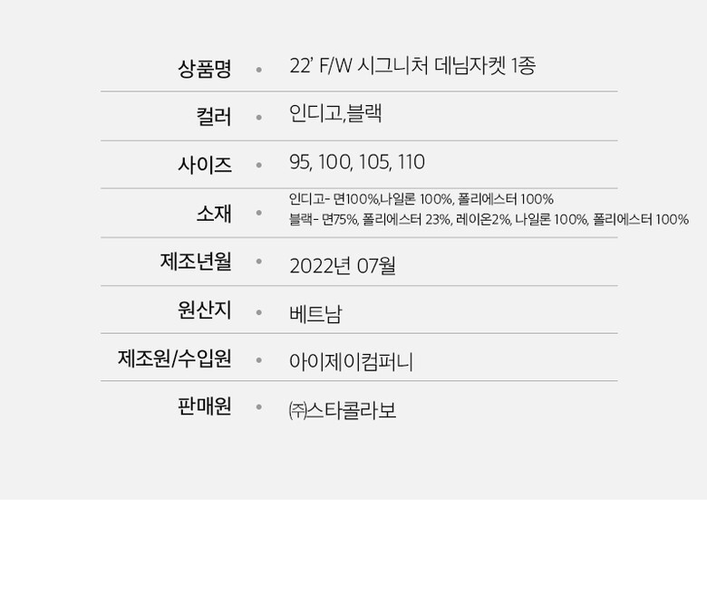 1. 제품 소재 (섬유의 조성 또는 혼용률을 백분율로 표시, 기능성인 경우 성적서 또는 허가서) | [트루릴리전] 남성 스탠다드 데님 자켓 2종택1 |
