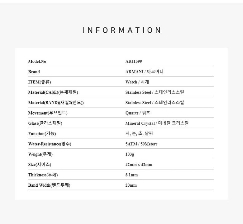 | 1. 소재 / 순도 / 밴드재질 | 실버/ 케이스 - 스테인리스스틸 / 밴드 - 스테인리스스틸 |