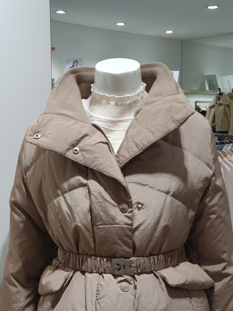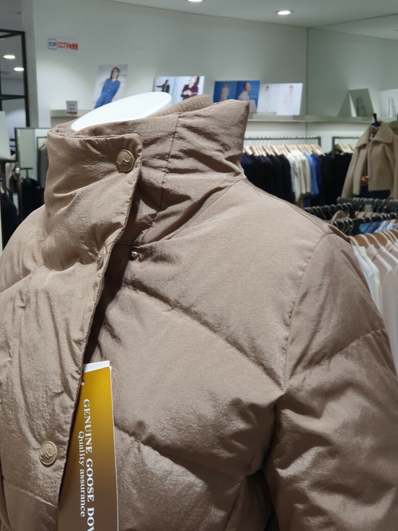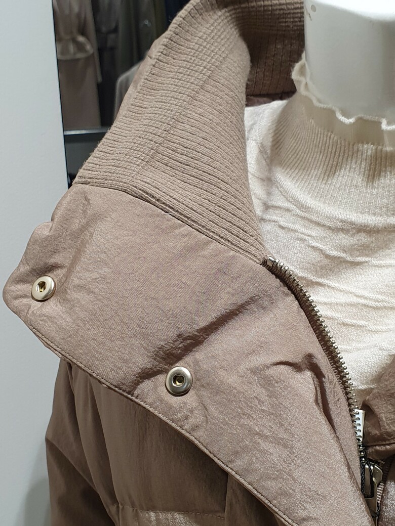 하이넥 디자인이며 넥 부분 니트 소재를 배색하여 보온성을 높여주며