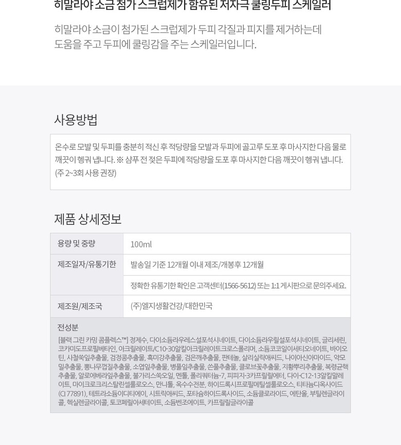 4. 사용방법 | 온수로 모발 및 두피를 충분히 적신 후 적당량을 모발과 두피에 골고루 도포 후 마사지한 다음 물로 깨끗이 헹궈 냅니다. 샴푸 전 젖은 두피에 적당량을 도포 후 마사지한 다음 깨끗이 헹궈 냅니다. (주 2~3회 사용 권장) |
