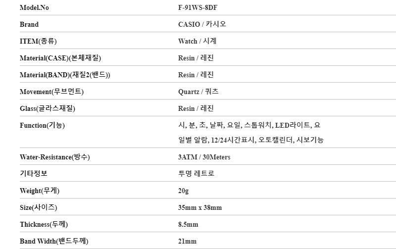 카시오 시계 F-91WS-8DF 투명 레트로 우레탄시계 당일발송