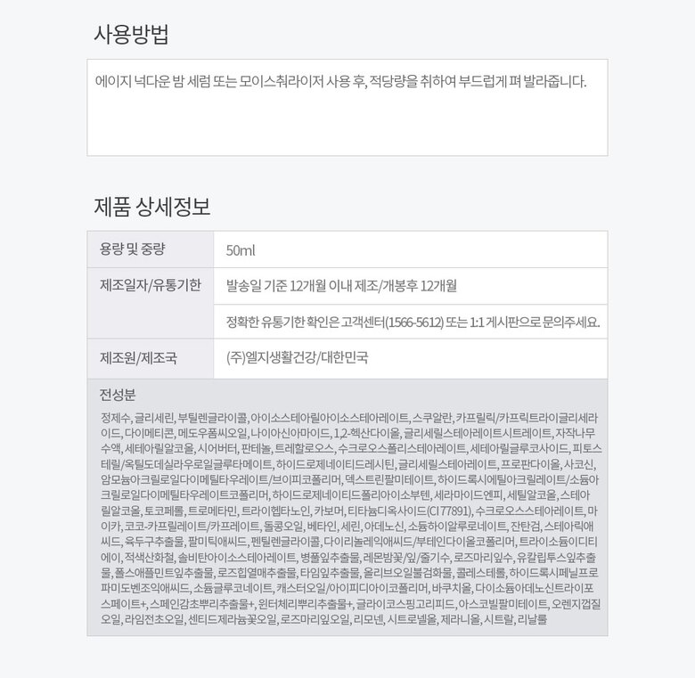 | 4. 사용방법 | 에이지 넉다운 밤 세럼 또는 모이스춰라이저 사용 후, 적당량을 취하여 부드럽게 펴 발라줍니다. |