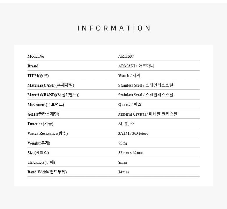 | 1. 소재 / 순도 / 밴드재질 | 실버/ 케이스 - 스테인리스스틸 / 밴드 - 스테인리스스틸 |
