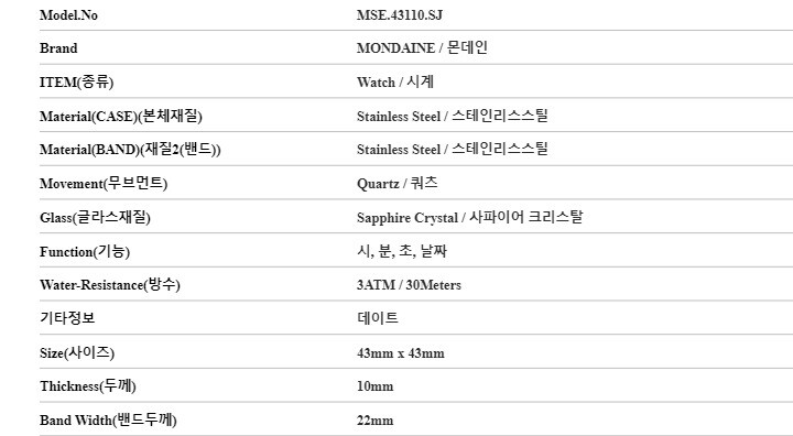 | 1. 소재 / 순도 / 밴드재질 | 화이트/ 케이스 - 스테인리스스틸 / 밴드 - 스테인리스스틸 |