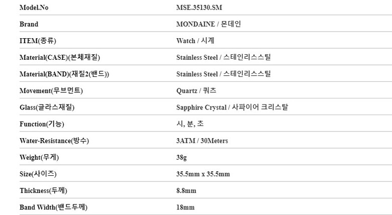 | 7. 주요 사양 | 스테인리스스틸 시계 쿼츠 |