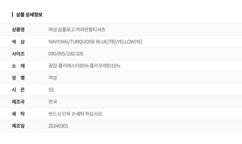 | 2. 색상 | NAVY(NA)/TURQUOISE BLUE(TB)/YELLOW(YE) |
