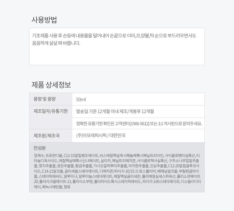 | 7. 주요성분 | 정제수, 프로판디올, C12-15알킬벤조에이트, 비스에칠헥실옥시페놀메톡시페닐트리아진, 사이클로펜타실록산, 티 타늄디옥사이드, 에칠헥실메톡시신나메이트, 실리카, 페닐트리메치콘, 사이클로헥사실록산, 구주소나무껍질추출 물, 영지추출물, 생강추출물, 황금추출물, 가시오갈피뿌리추출물, 외 |