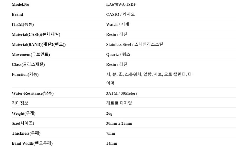 | 7. 주요 사양 | 레진 시계 쿼츠 |