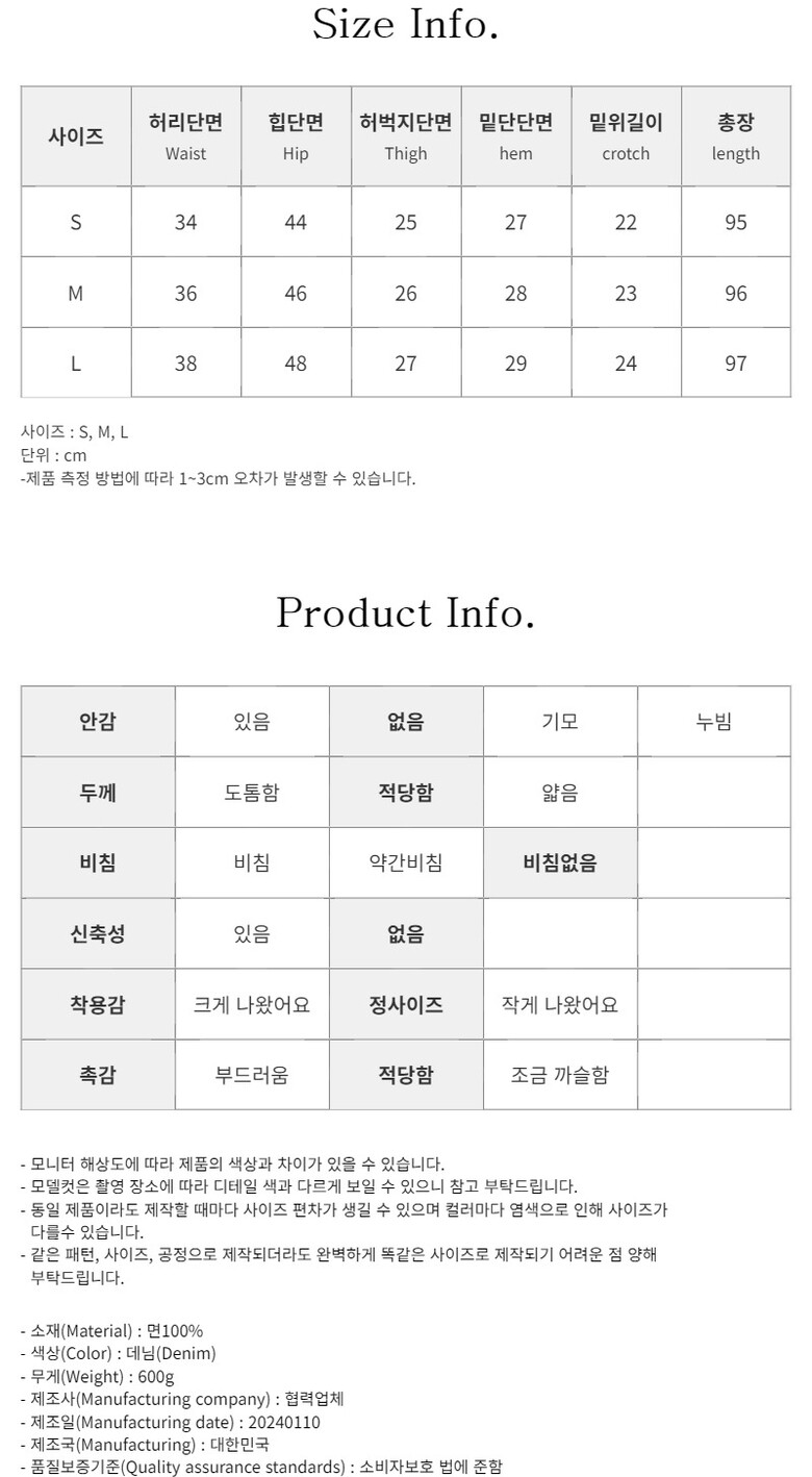 허리단면 / 힙단면 / 허벅지단면 / 밑단단면 / 밑위길이 / 총장 (S)34 / 44 / 25 / 27 / 22 / 95 (M)36 / 46 / 26 / 28 / 23 / 96 (L)38 / 48 / 27 / 29 / 24 / 97