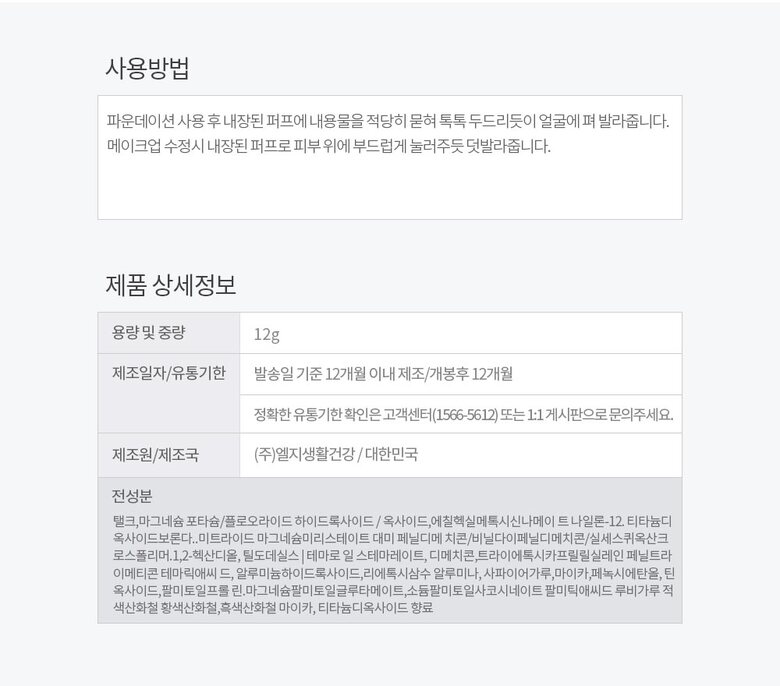 | 4. 사용방법 | 파운데이션 사용 후 내장된 퍼프에 내용물을 적당히 묻혀 톡톡 두드리듯이 얼굴에 펴 발라줍니다. 메이크업 수정시 내장된 퍼프로 피부 위에 부드럽게 눌러주듯 덧발라줍니다. |