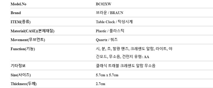 | 7. 주요 사양 | 플라스틱 탁상시계 쿼츠 |