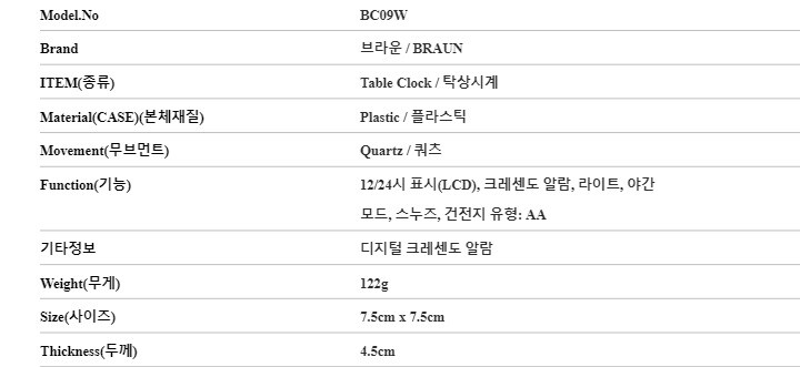 7. 주요 사양 | 플라스틱 탁상시계 쿼츠 |
