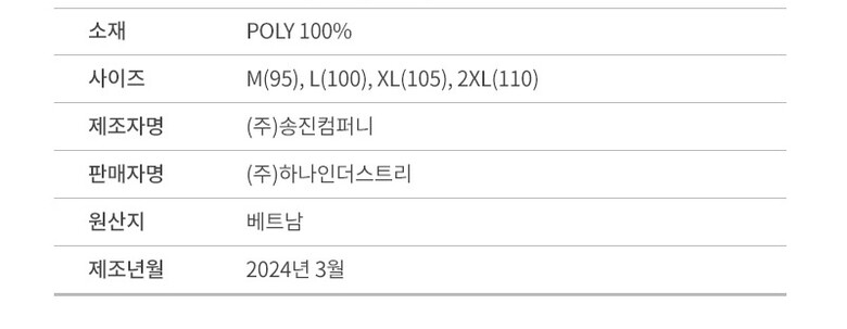 1. 제품 소재 (섬유의 조성 또는 혼용률을 백분율로 표시, 기능성인 경우 성적서 또는 허가서) 폴리 100%