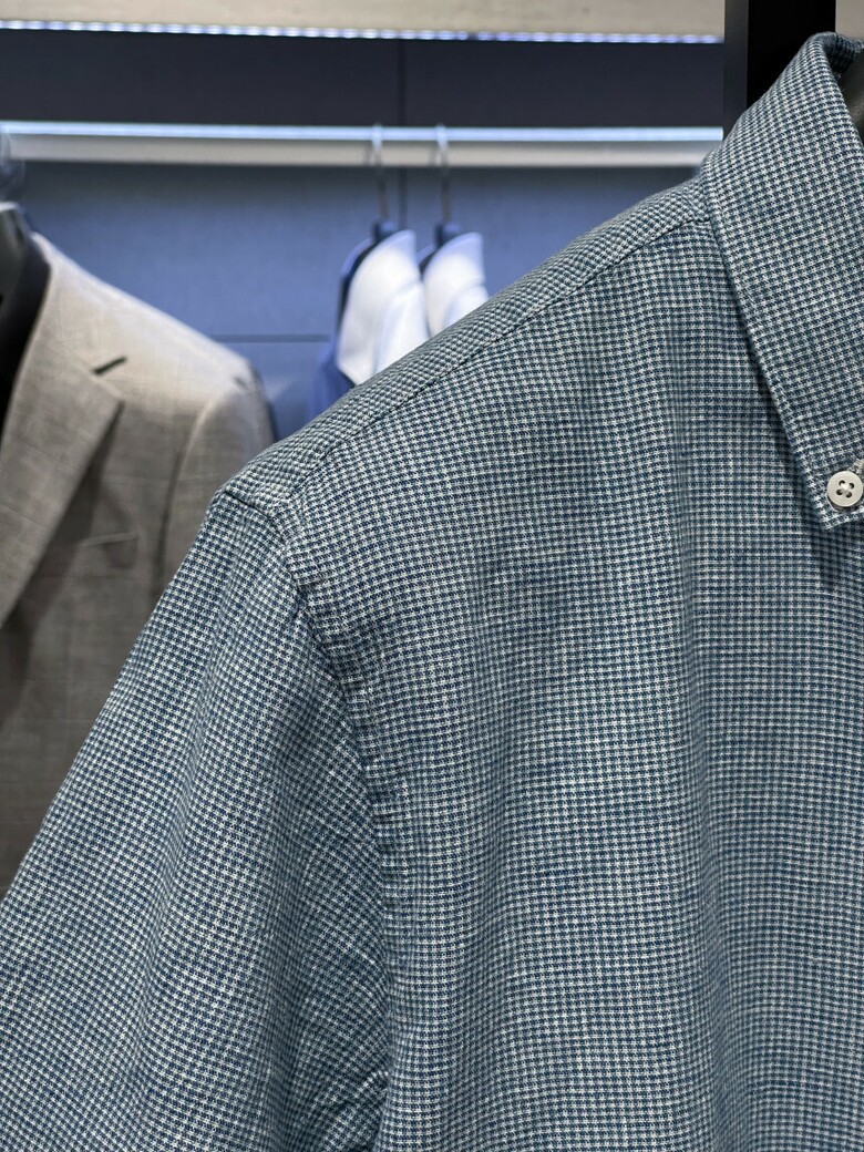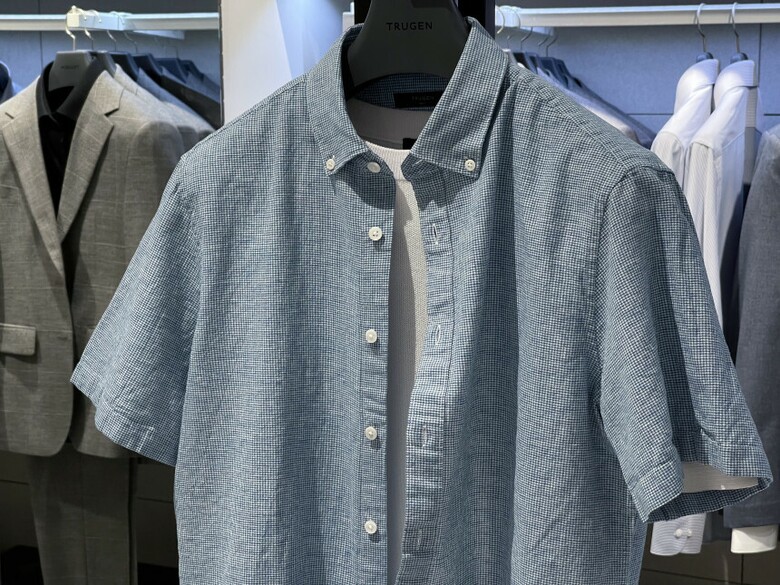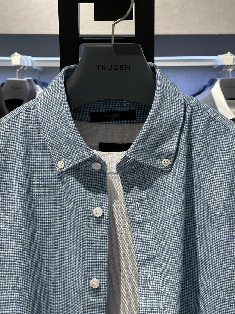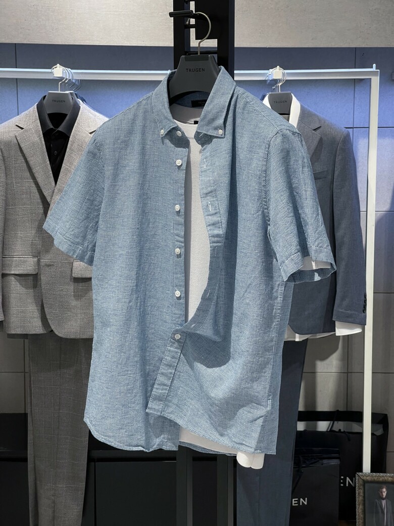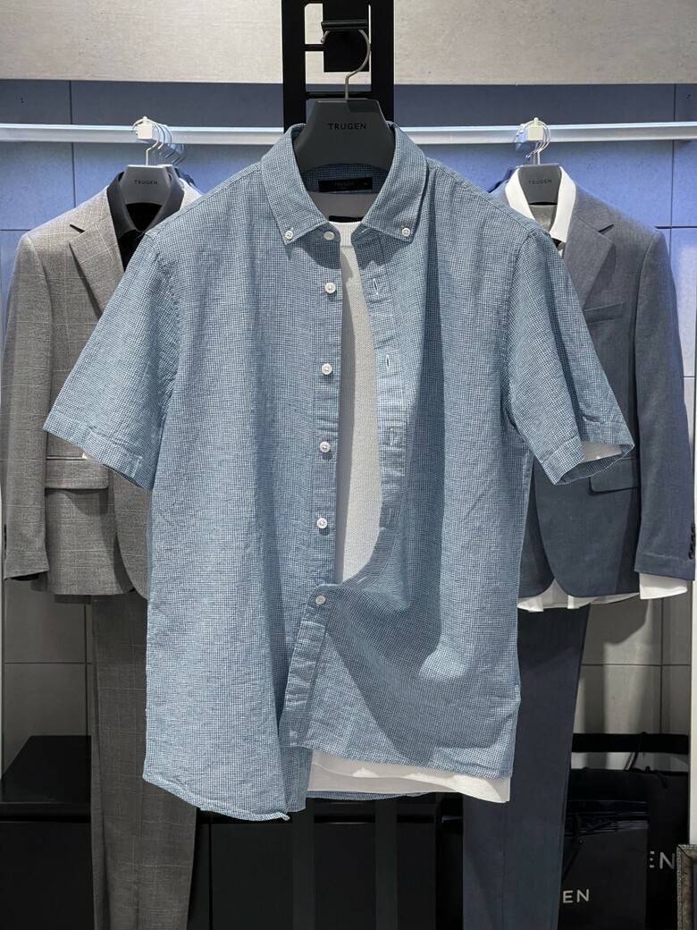 트루젠 라이트블루체크 린넨코튼 혼방 쿨워셔블 워싱 반팔 캐주얼 셔츠 426617061237-1