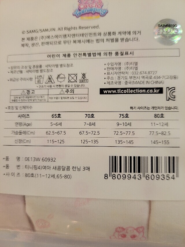 티니핑 여아새콤달콤런닝 3매