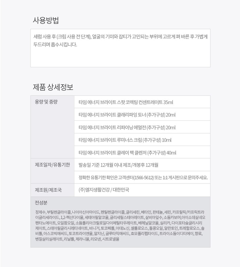 | 4. 사용방법 | 세럼 사용 후 (크림 사용 전 단계), 얼굴의 기미와 잡티가 고민되는 부위에 고르게 펴 바른 후 가볍게 두드리며 흡수시킵니다. |