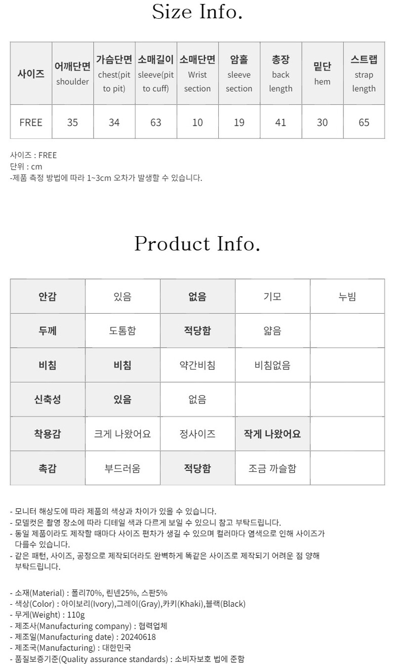 - FABRIC(소재) : 폴리70%, 린넨25%, 스판5%