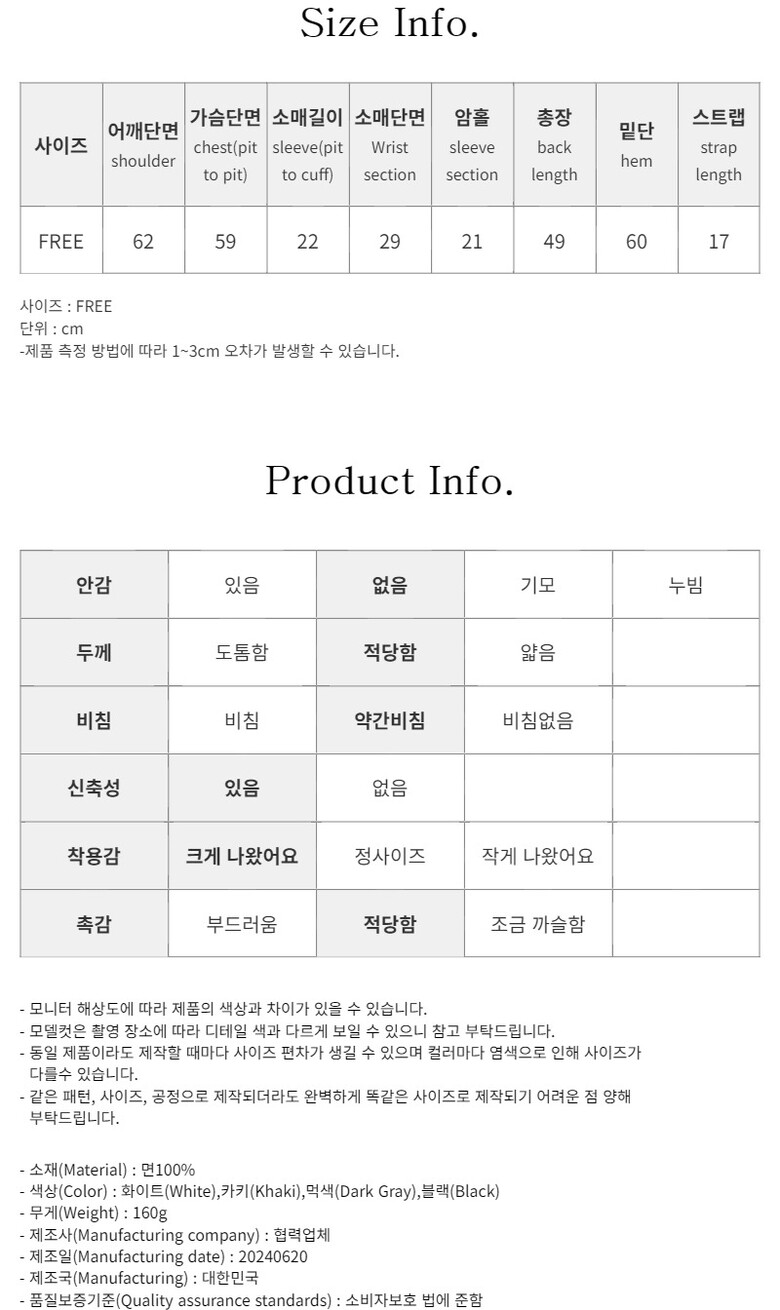 - COLOR(색상) : 화이트(White),카키(Khaki),먹색(Dark Gray),블랙(Black)