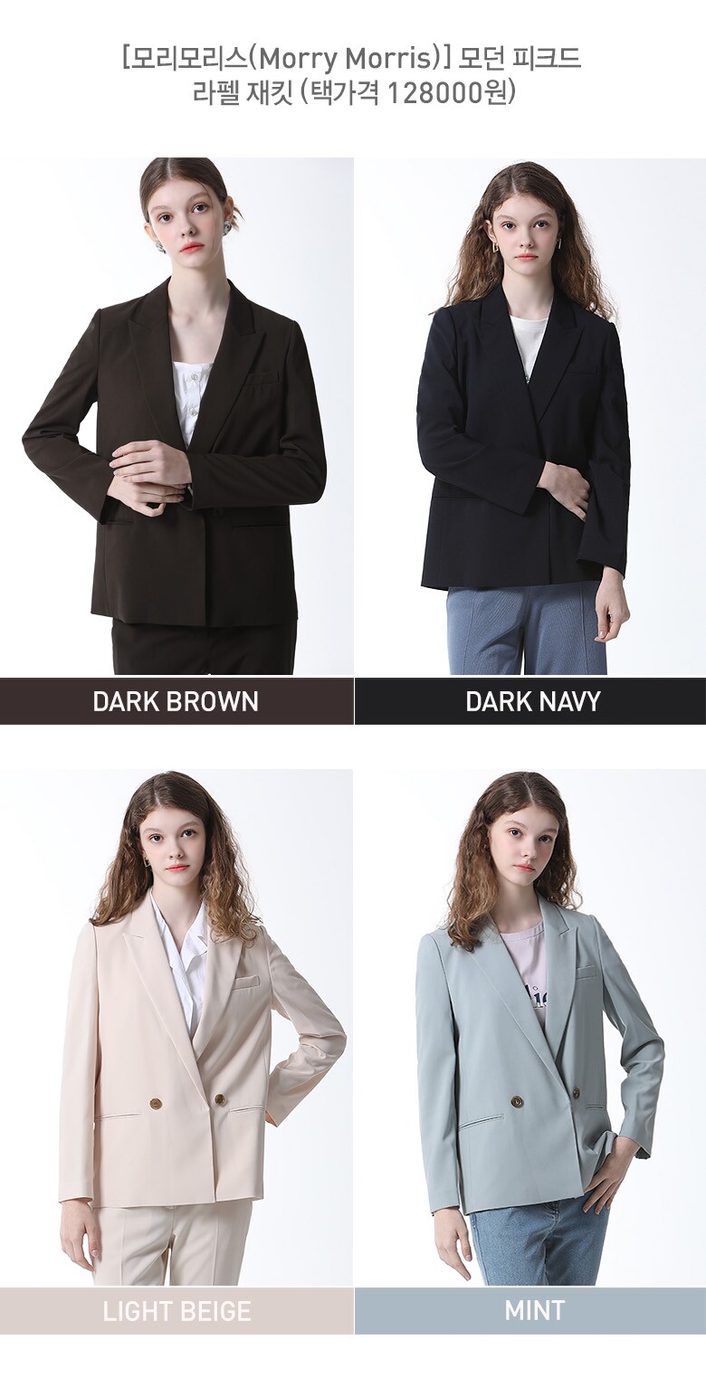 ▶ ITEM : 모던 피크드 라펠 재킷 ▶ NUMBER : MAWSJKL21020 ▶ FABRIC : 겉감:폴리에스터100% 안감:폴리에스터100% ▶ WASHING : 단독드라이(이염.필링.고온건조 다림질불가) ▶ 원 산 지 : 베 트 남 ▶ 색 상 : 다크네이비(DN),다크브라운(DW),라이트베이지(LB),민트(MI)