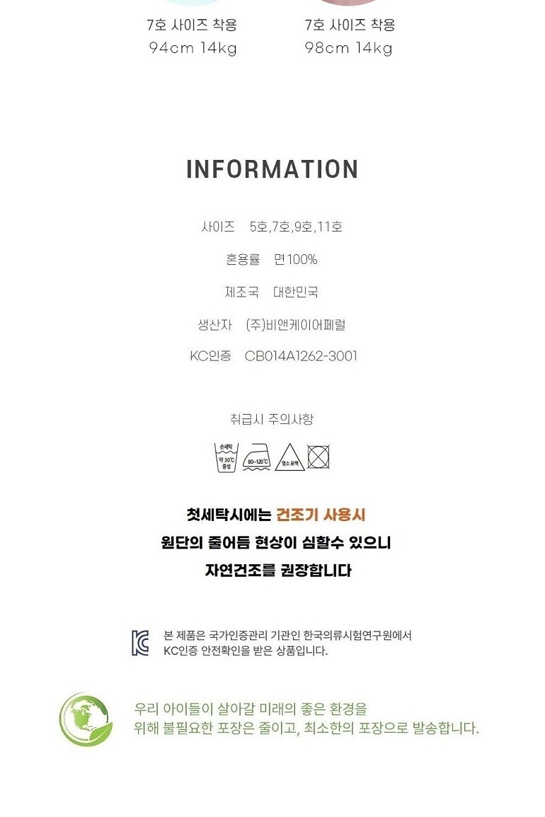| 1. 제품 소재 (섬유의 조성 또는 혼용률을 백분율로 표시, 기능성인 경우 성적서 또는 허가서) | 상세페이지 참조 |