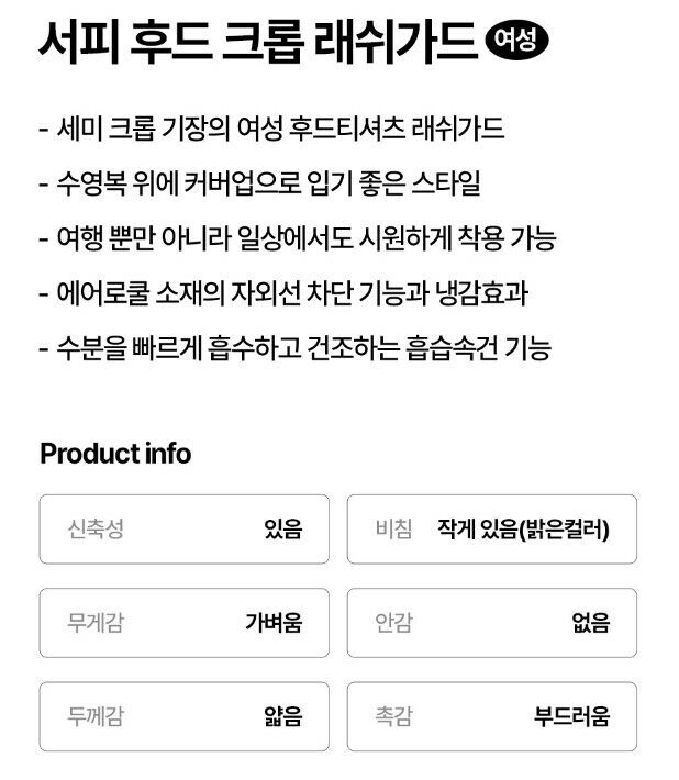 | 1. 제품 소재 (섬유의 조성 또는 혼용률을 백분율로 표시, 기능성인 경우 성적서 또는 허가서) | 상품상세참조 |