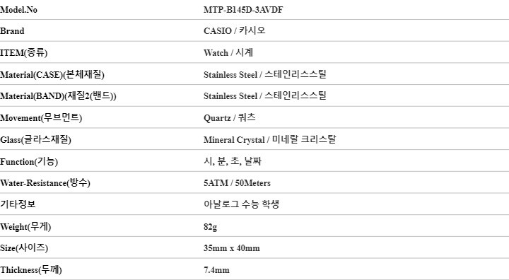 | 7. 주요 사양 | 스테인리스스틸 시계 쿼츠 |