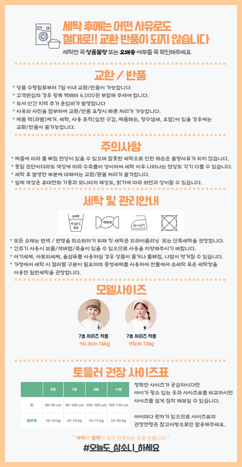 • 처음 배송된 상품상태와 다를 경우(세탁/착용 후 외출하신 경우) 반품이 불가합니다.